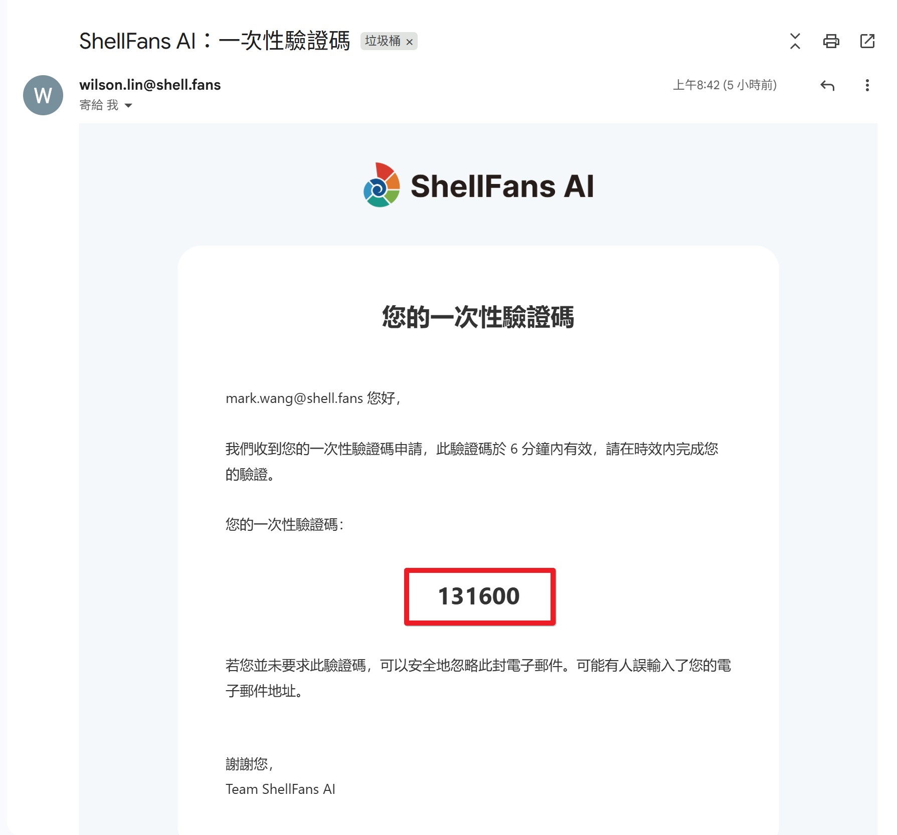 3.前往您 Email 地址的電子信箱,收取主旨為「ShellFans AI:一次性驗證碼」的信件。