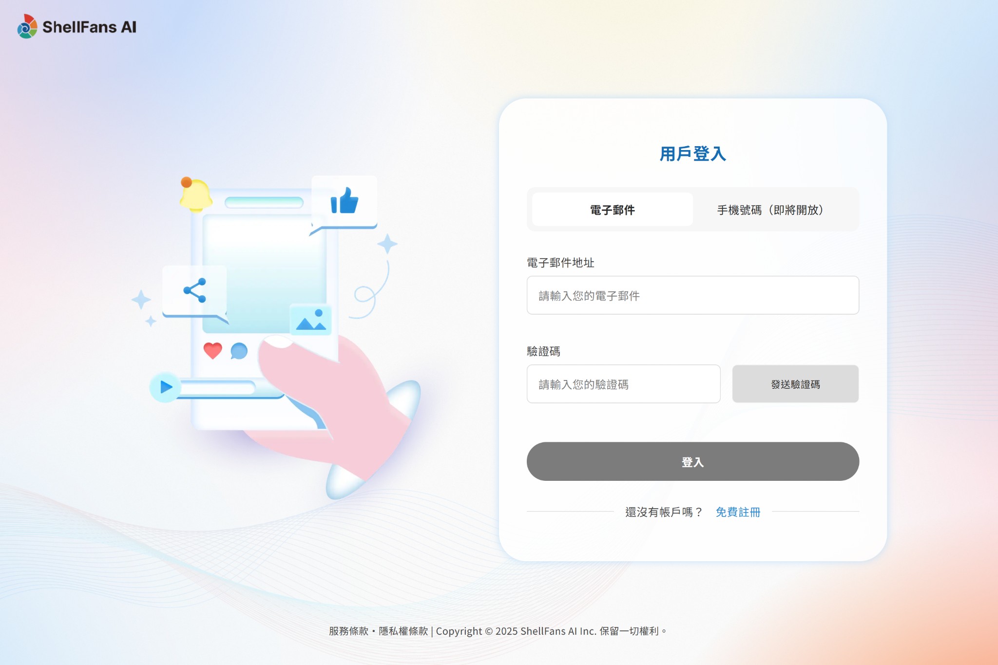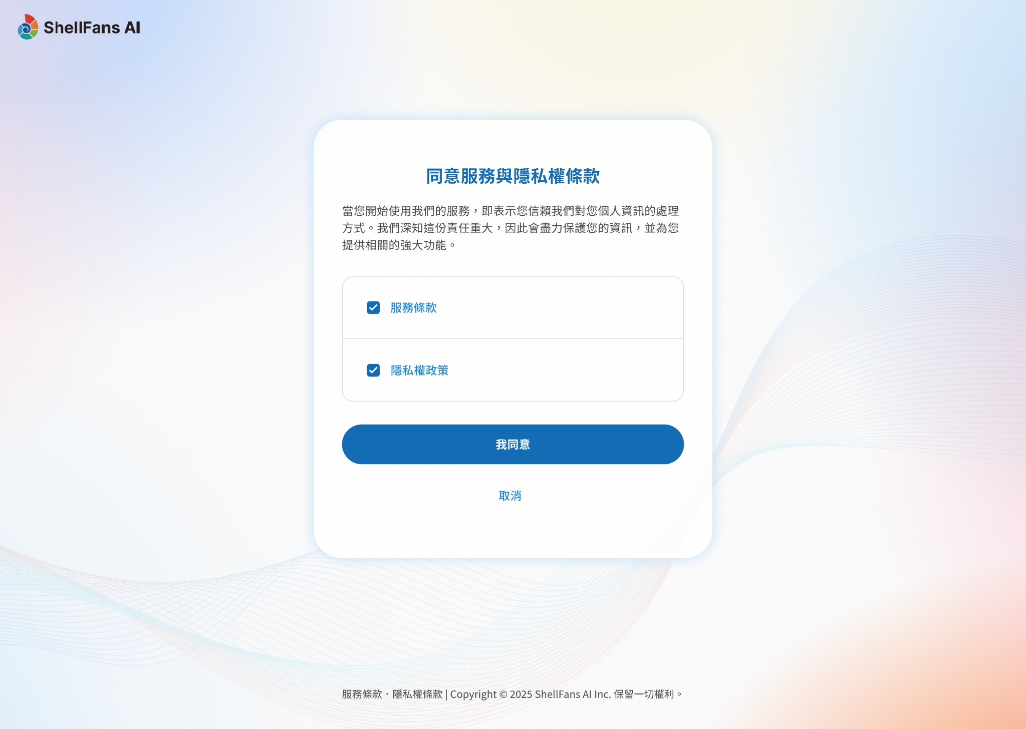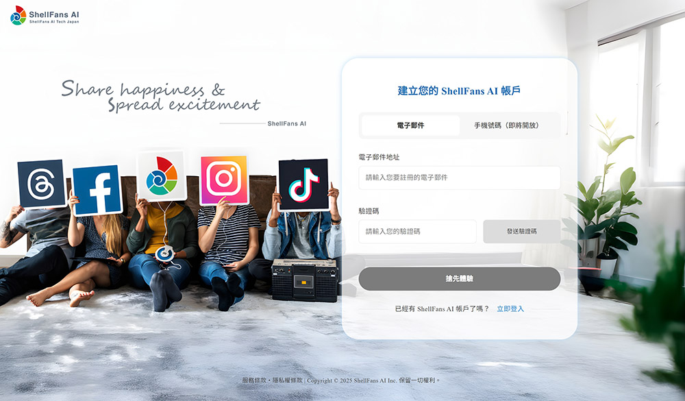 ●若您不同意我們的服務條款、隱私權條款,請在同意使用條款的頁面中,立即關閉ShellFans AI 的視窗,中止後續的註冊流程。