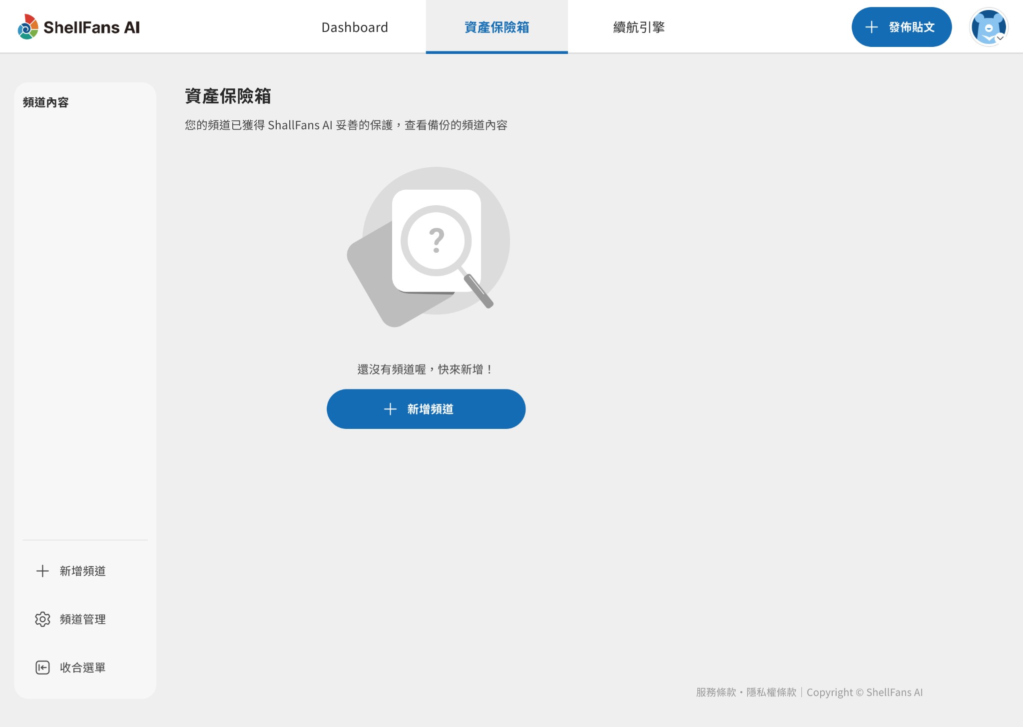 ● 當 ShellFans AI 正在進行備份時,您可在「資產保險箱」介面上,檢視提示訊息:「頻道內容備份中 | 預計完成時間:hh:mm」。備份完成後,該提示將自動隱藏。