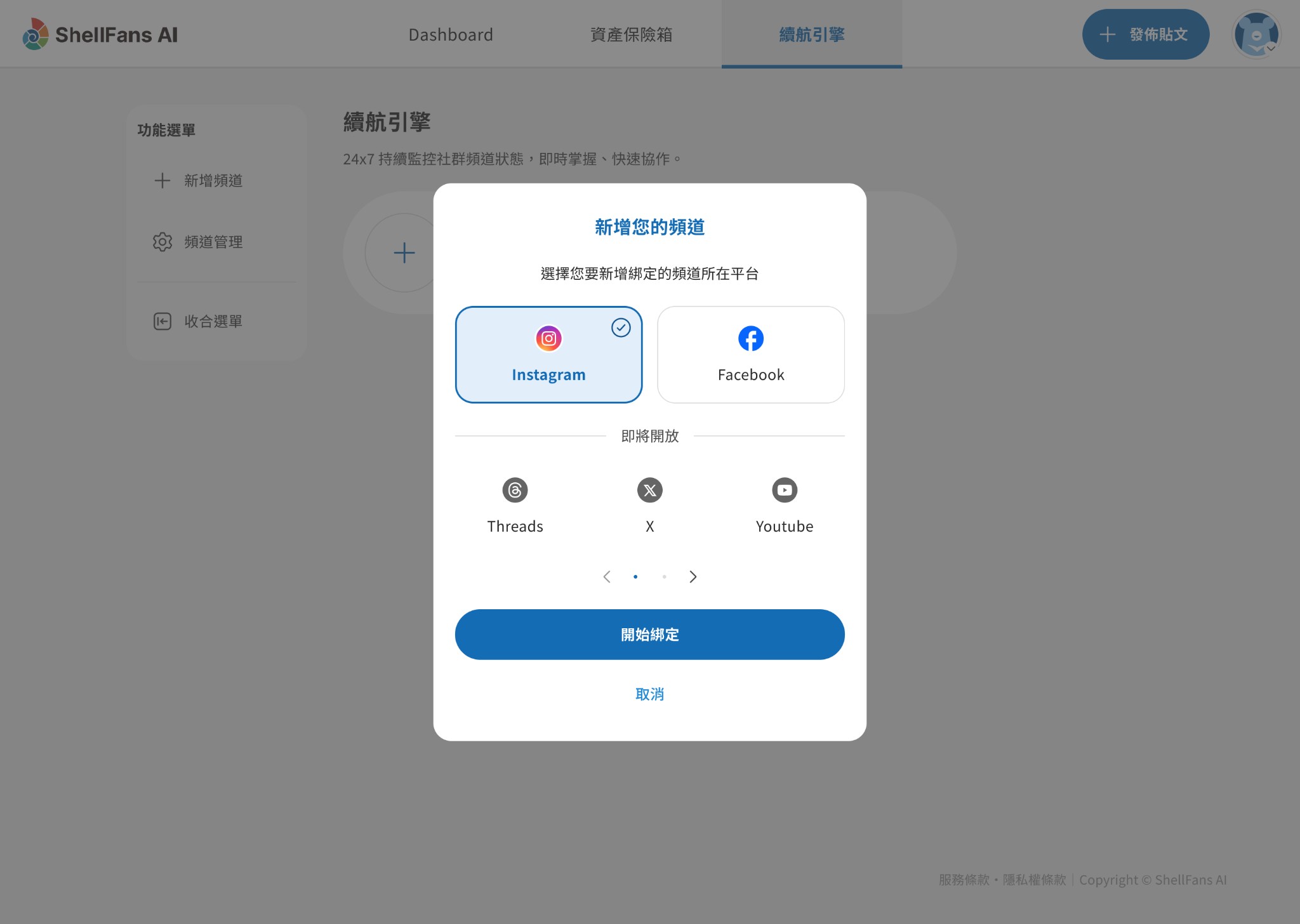 9.點擊「開始綁定」按鈕後,系統關閉彈窗。 綁定完成!系統將開始進行首次的貼文備份、實時監控頻道健康度。